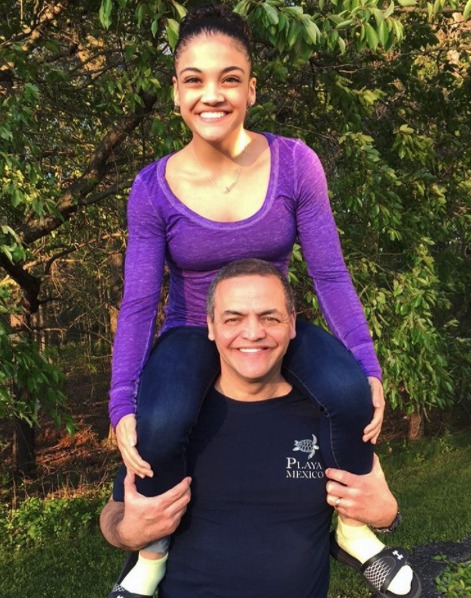 Su apodo es "Emoji Humano" por todas las expresiones faciales que realiza en sus rutinas. En la foto se la ve muy sonriente posando en los hombros de su padre Anthony. (Laurie Hernandez/Instagram)