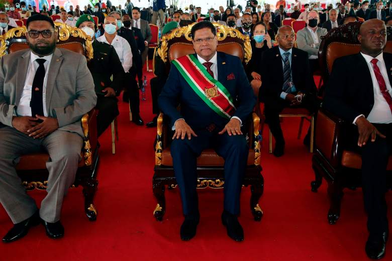 GettyRonnie Brunswijk (der.) con el presidente de Guyana Irfaan Ali, y el presidente de Surinam Chan Santokhi (medio)