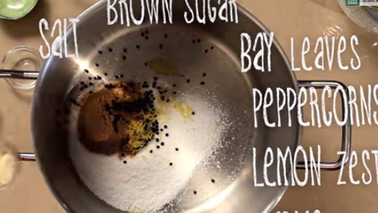 1. Combinar la sal, el azúcar, hierbas y 1/2 galón (8 tazas) de agua en una olla grande sobre un fuego medio