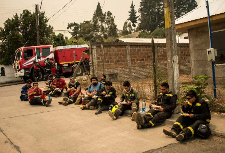 Bomberos se toman un descanso después de pasar horas batallando contra el infernal fuego en Chile. (Getty)