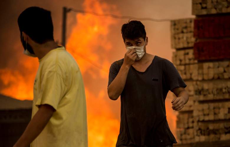 Un hombre trata de protegerse con una mascara durante el fuego forestal en Chile. (Getty)