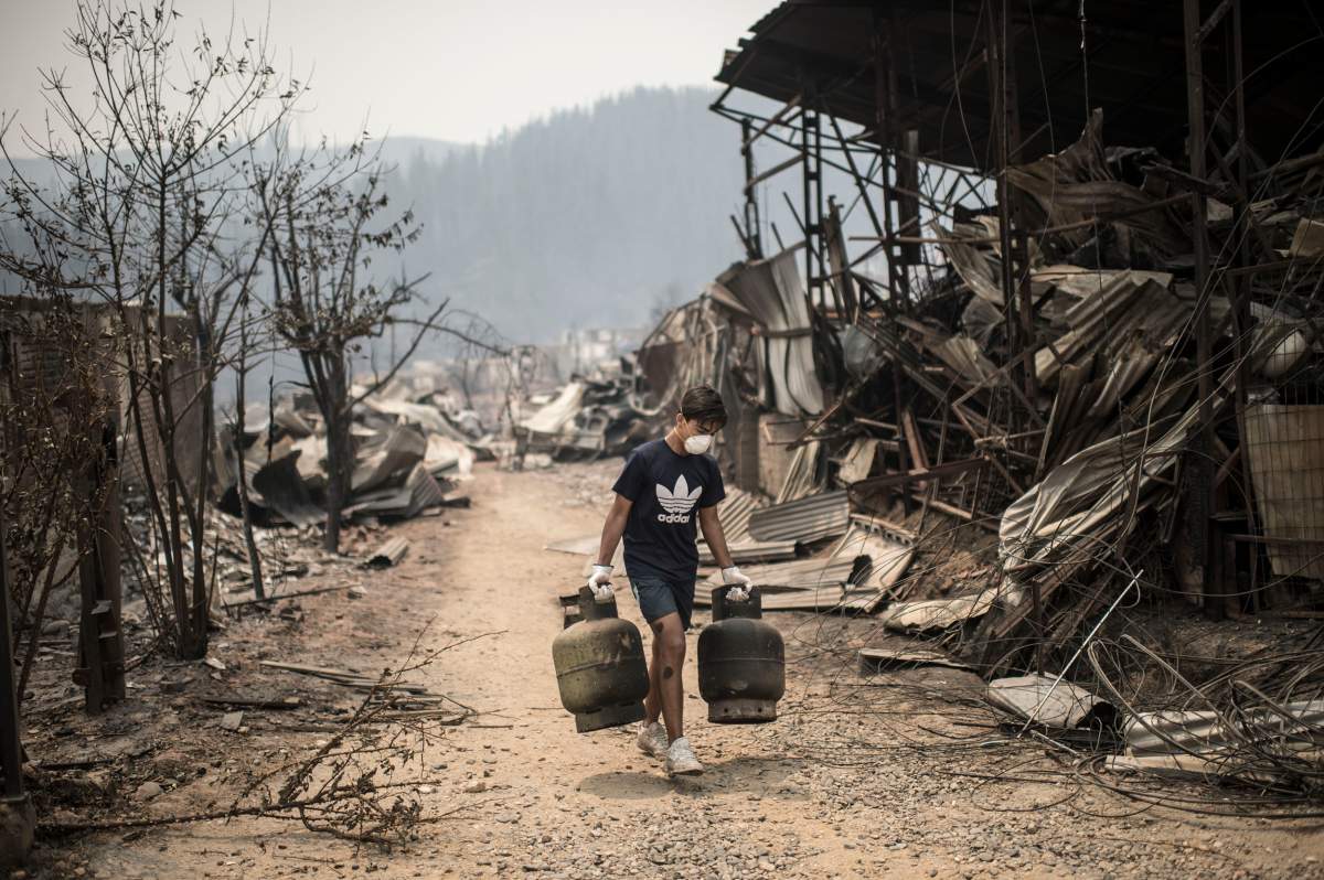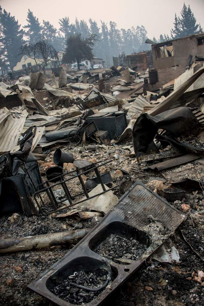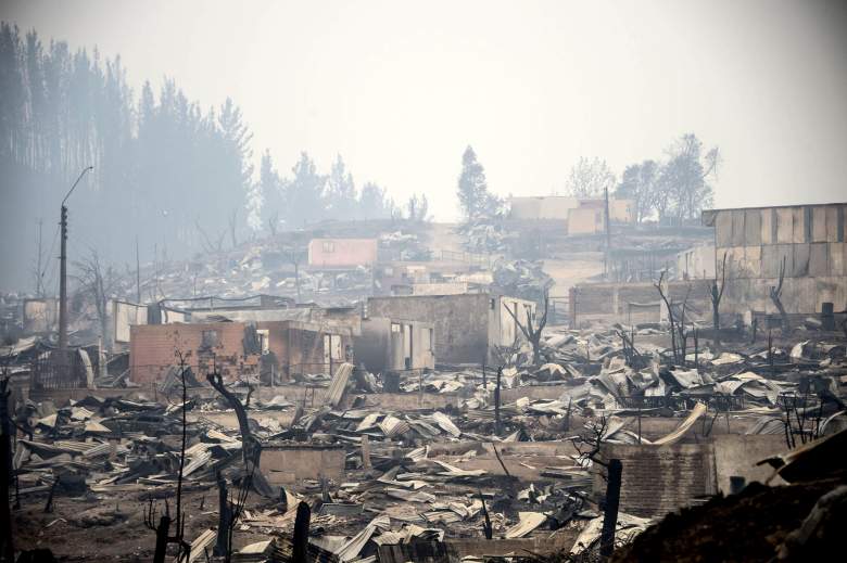 Esta una foto de Santa Olga, lugar que fue destruido por el fuego forestal a 330 kilometros de al sur de Santiago, 27 de enero de 2017. Seis personas murieron, entre ellos cuatro bomberos y 2 policías, que batallaban contra uno de los peores fuegos forestales en la historia de Chile. (Getty)
