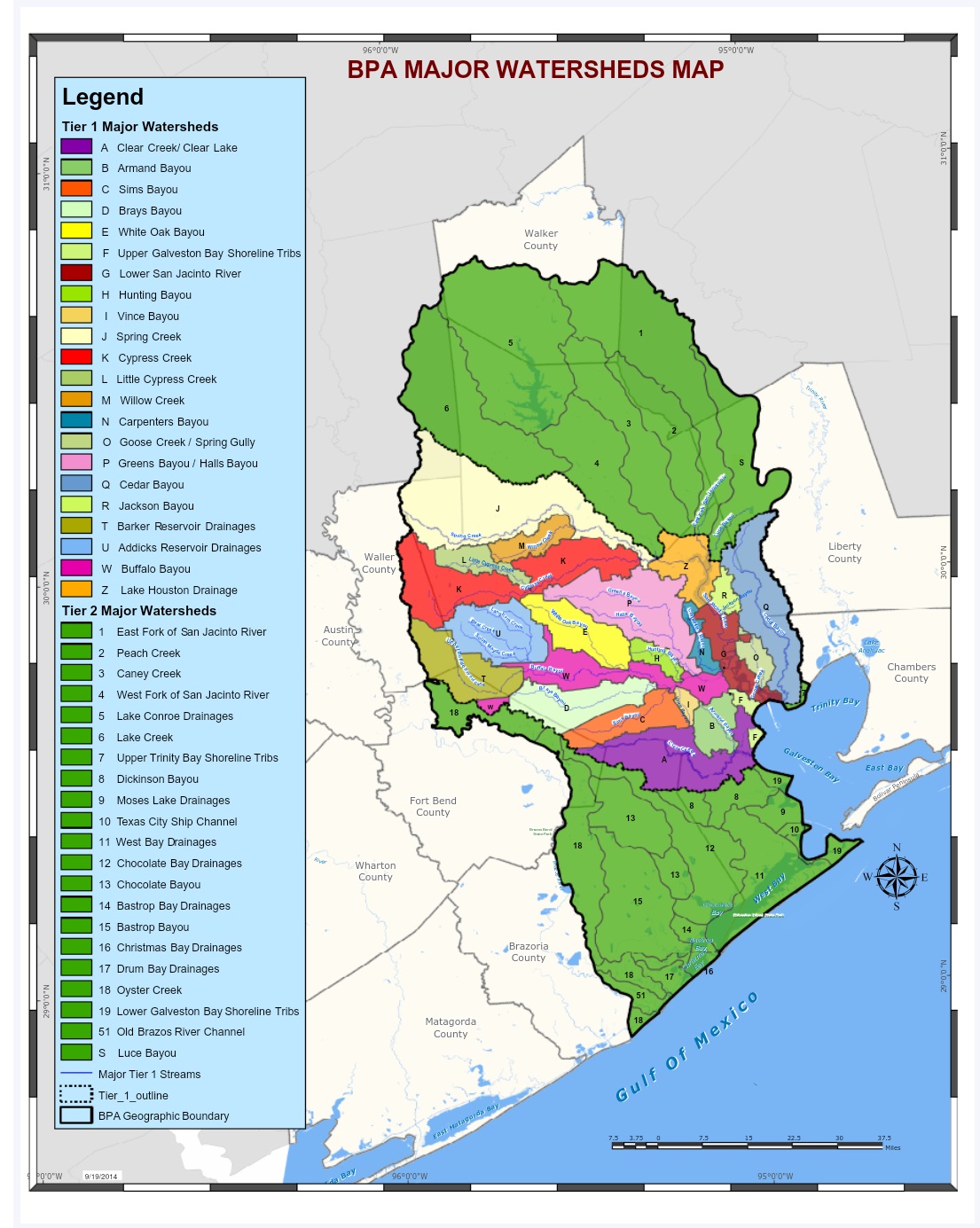 - Goose Creek / Spring Gully: Área de drenaje, 32 metros cuadrados. Millas, millas de flujo abierto: 60 millas. “El segmento 1 es Riley Fuzzel Rd. Puente a Jesse H. Jones County Park. El segmento 2 es Jesse H. Jones Park a Hwy. 59 N. Bridge.