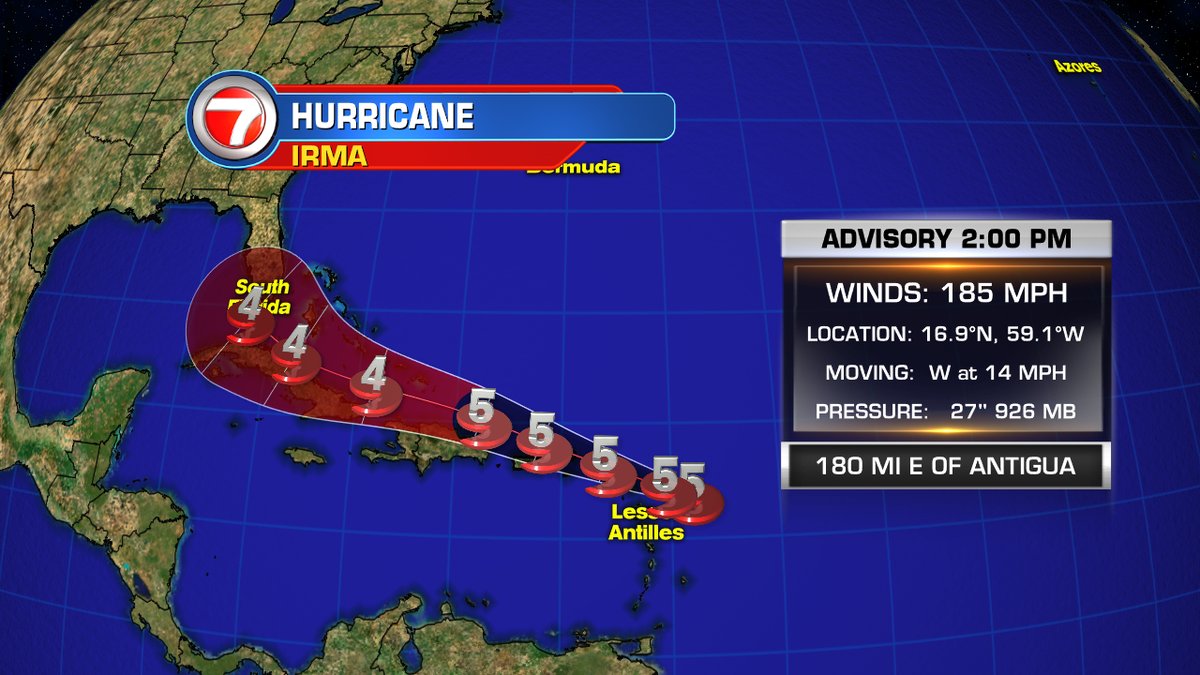 A partir de las 2 pm, Irma estaba localizada cerca de la latitud 16.9 Norte, longitud 59.1 oeste, rumbo al oeste a 14 mph. La fuerza del fenómeno puede cambiar a medida que avanza, pero los expertos dicen que probablemente seguirá siendo categoría 5 o 4. Los vientos máximos sostenidos fueron 185 mph. La última presión central mínima fue de 926 mb.
