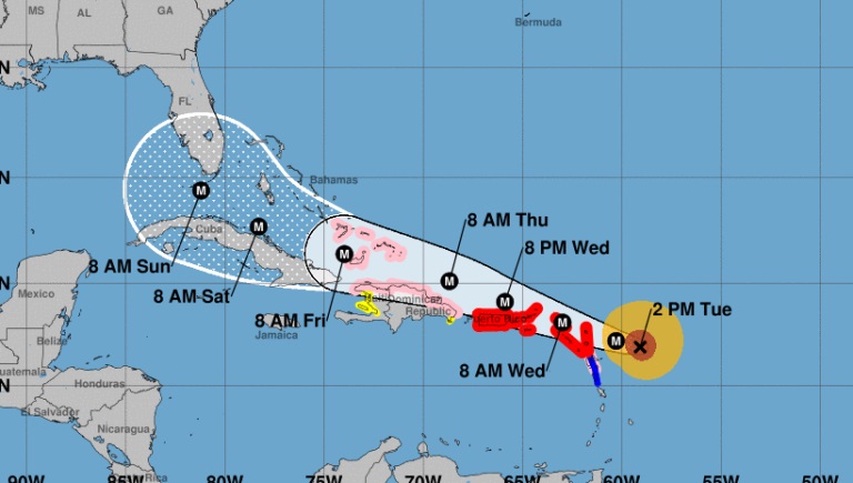 El Centro Nacional de Huracanes, indicó que las Islas de Leeward, serán golpeadas por vientos catastróficos esta noche, e Irma llegará a Puerto Rico y las Islas Vírgenes el miércoles por la noche, y luego a República Dominicana y Haití 24 horas después. Después pasará a Cuba el viernes. Más allá de eso, es difícil predecir dónde irá la tormenta, pero el sur de la Florida, especialmente los Cayos, están cada vez más dispuestos a estar en su camino.