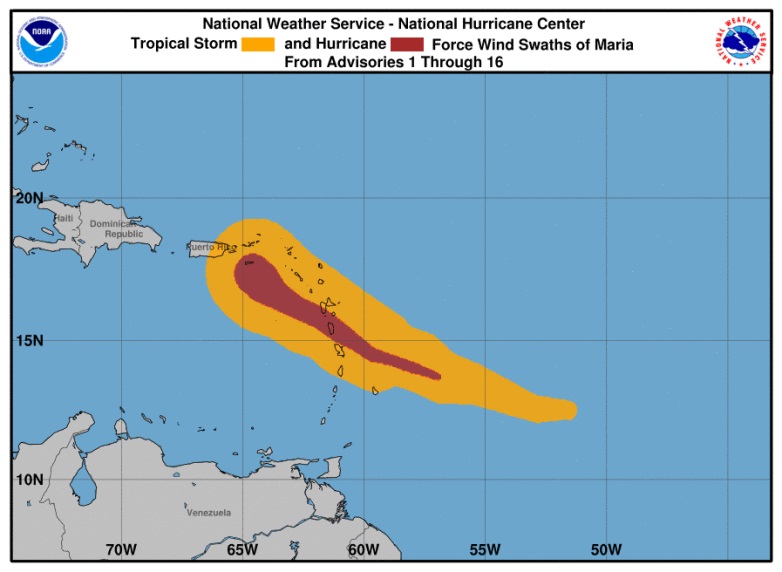 El ojo del huracán María “se moverá cerca o sobre St. Croix en las Islas Vírgenes de EE.UU. en el próximo par de horas, luego de cruzar Puerto Rico el miércoles y pasar justo al norte de la costa noreste de la República Dominicana, el miércoles por la noche y el jueves en la maána”, dijo el Centro Nacional de Huracanes.