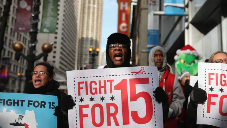 Un grupo de manifestantes exigen un aumento en el pago de salario para los trabajadores de comida rápida y los minoristas protestan en el Loop el 5 de diciembre de 2013 en Chicago, Illinois.Getty