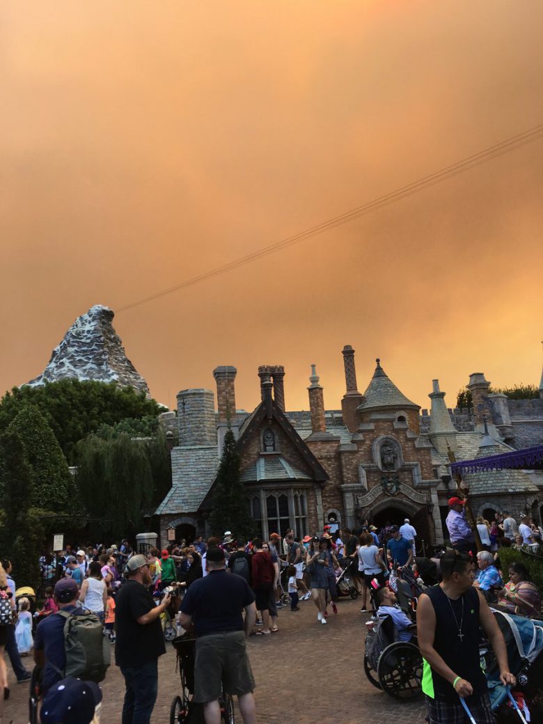 La escena en Disneyland fue sorprendente, y causó que algunas personas dejaran el parque debido a la calidad del aire, y un informe dijo que los invitados fueron evacuados de un paseo. A pesar de los incendios cercanos, el parque ha permanecido abierto.