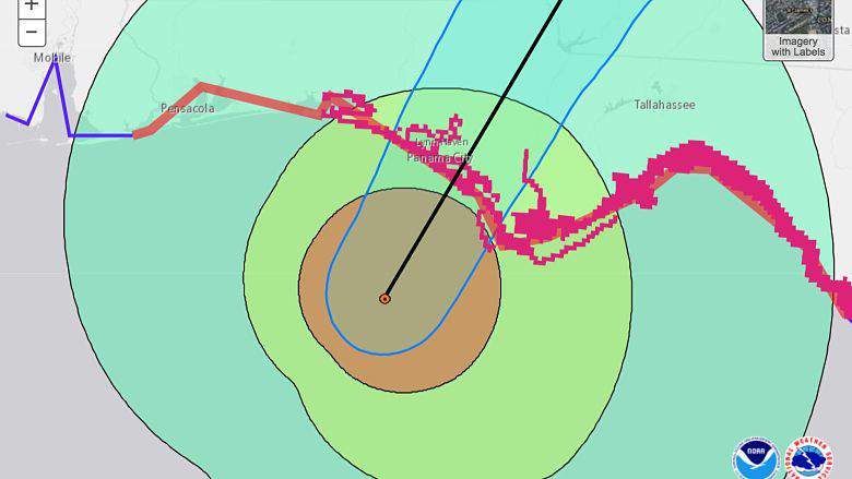 El Huracán Michael se ha acercado al centro de la Florida y el centro de la tormenta estará en tierra dentro de la próxima hora. Pensacola, Florida, está experimentando fuertes lluvias y vientos constantes de la tormenta de categoría 4. Un aviso de huracán está vigente para todo el condado de Escambia.