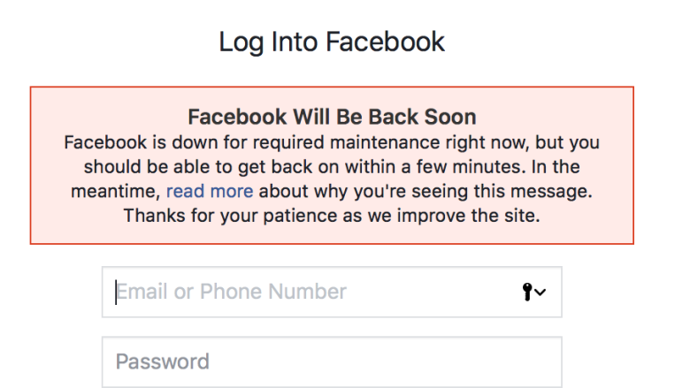 Solo 12 horas después de Gmail sufriera una interrupción , Facebook no está trabajando en estos momentos. El sitio dice que se encuentra en mantenimiento. Messenger también está interrumpido. Instagram, propiedad de Facebook, también está interrumpido. Facebook también es dueño de Whatsapp, y tampoco está funcionando. La World Wide Web cumple 30 años hoy.