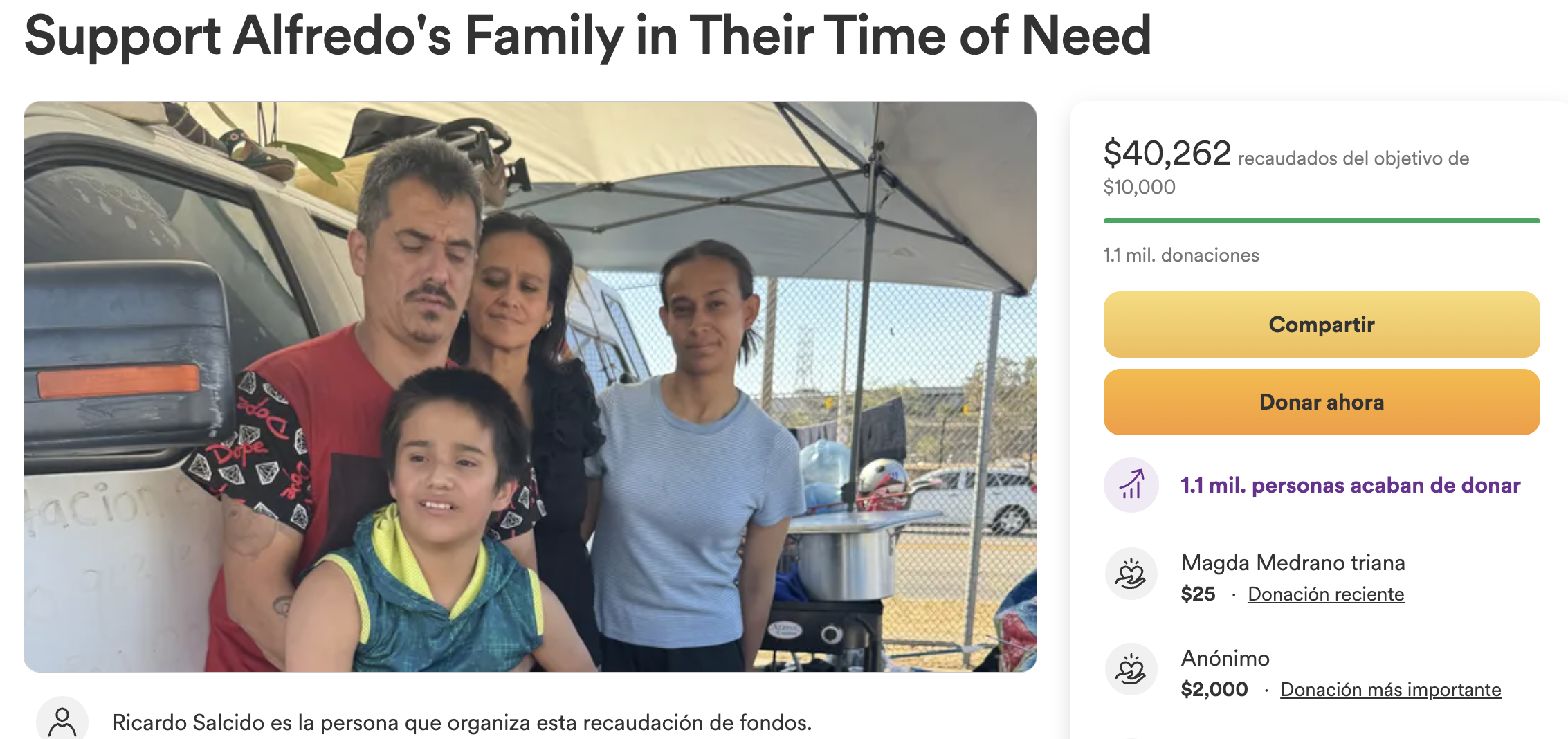 “Alfredo fue víctima de un hombre mayor que lo abofeteó en la parada del autobús. Tiene autismo severo y su familia necesita ayuda desesperadamente”, dice la página de recaudación. “Cualquier ayuda sería muy apreciada por ellos. Actualmente, no tienen hogar y cualquier aporte les ayudaría a conseguir alguna vivienda”.