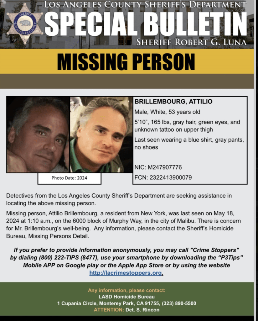 “La persona desaparecida, Attillo Brillembourg, residente de Nueva York, fue vista por última vez el 18 de mayo de 2024, a la 1:10 a.m., en la cuadra 6000 de Murphy Way, en la ciudad de Malibú”, dice el boletín. “Existe preocupación por el bienestar del señor Brillembourg. Cualquier información, comuníquese con la Oficina de Homicidios del Sheriff, Detalle de Personas Desaparecidas”.
