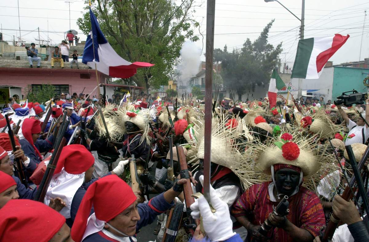 Los mexicanos celebran el Cinco de Mayo con una recreación de la batalla de 1862 entre los franceses y los indios de Zacapuaxtlas el 5 de mayo de 2001 en Puebla, México.
