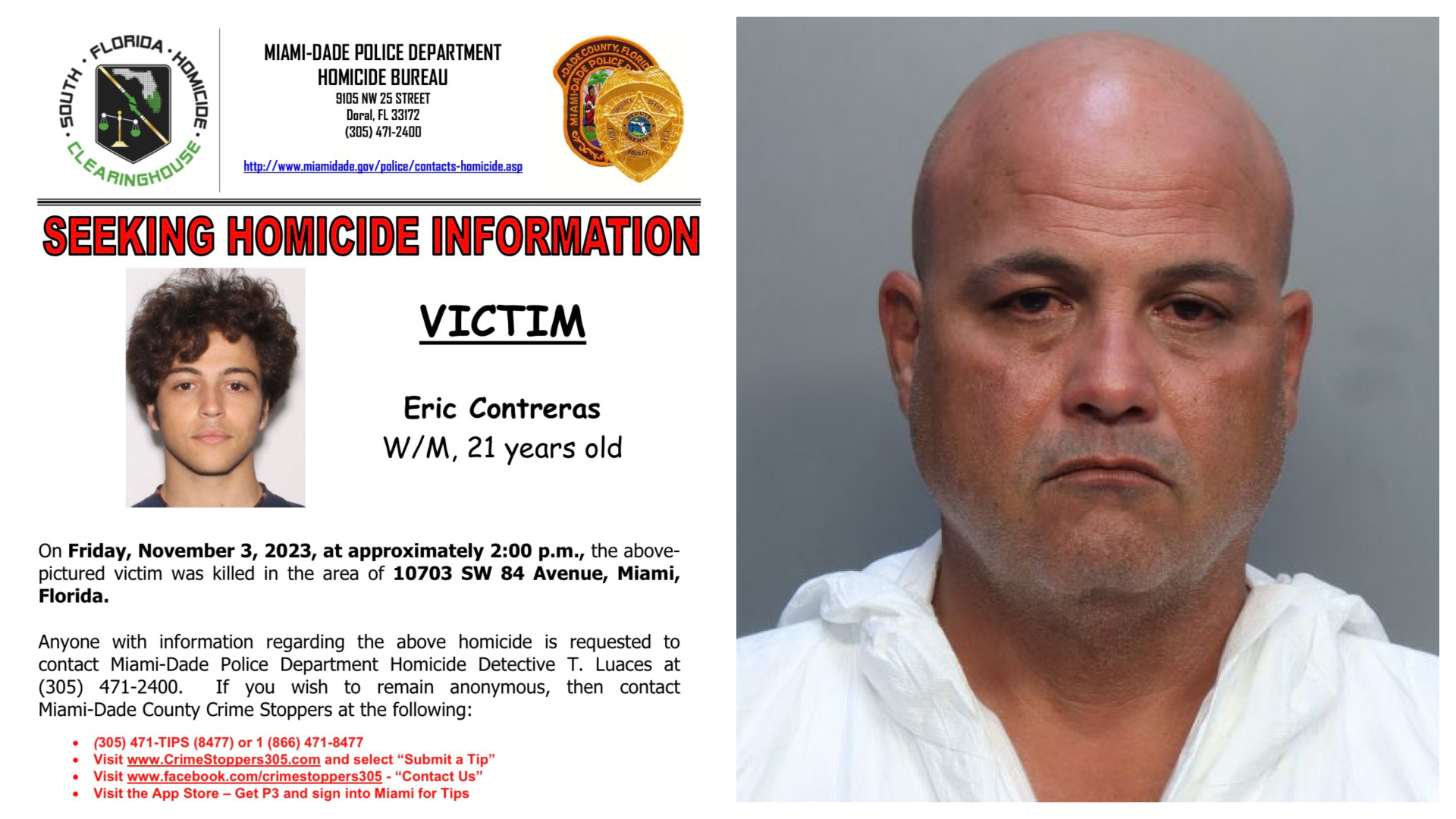 El caso de violencia domestica aconteció a las 2:00 de la tarde del pasado viernes 3 de noviembre, en una residencia localizada en el 8400 SW 107th St., hasta donde llegó la policía y funcionarios del cuerpo de bomberos atendiendo al llamado de urgencia a la línea del 911 realizada por el mismo victimario, Davis contreras de 52 años, quien informo haberle disparado a su propio hijo, Eric contreras de 25.