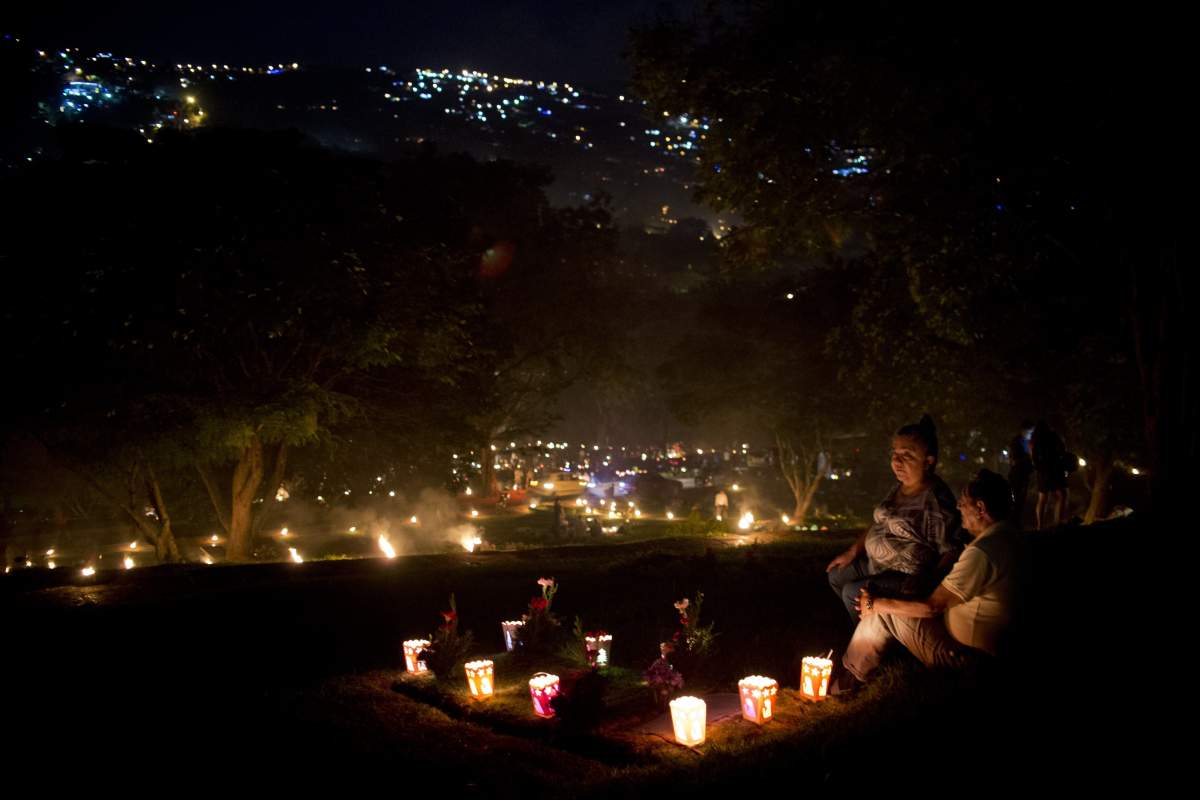 Una pareja mantiene vigilia ante la tumba de un familiar en el cementerio "La Aurora" durante las celebraciones del Día de las Velitas en vísperas de la Inmaculada Concepción en Cali, Departamento del Valle del Cauca, Colombia.
