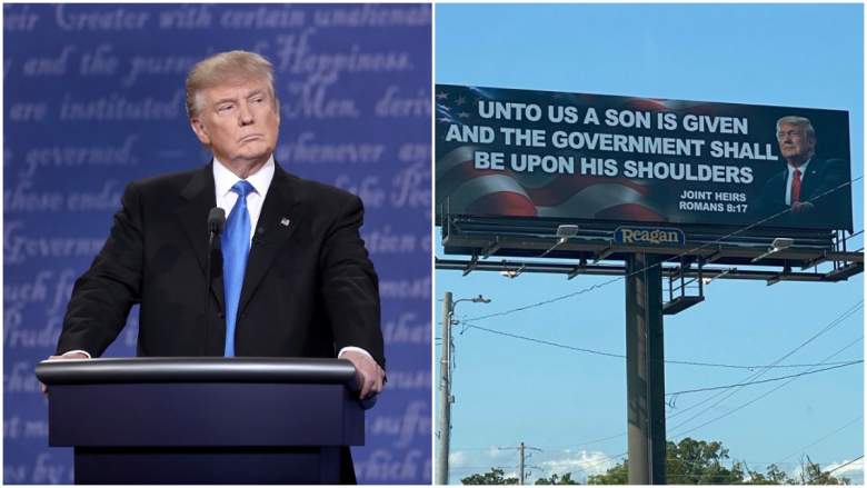 Se está debatiendo el significado exacto de la valla publicitaria, pero contiene un versículo de la Biblia en letras grandes junto a una foto de Trump que dice: “Se nos ha dado un hijo y el gobierno estará sobre sus hombros”. Este versículo de la Biblia se refiere a Isaías 9:6, que era una profecía acerca de Jesucristo.