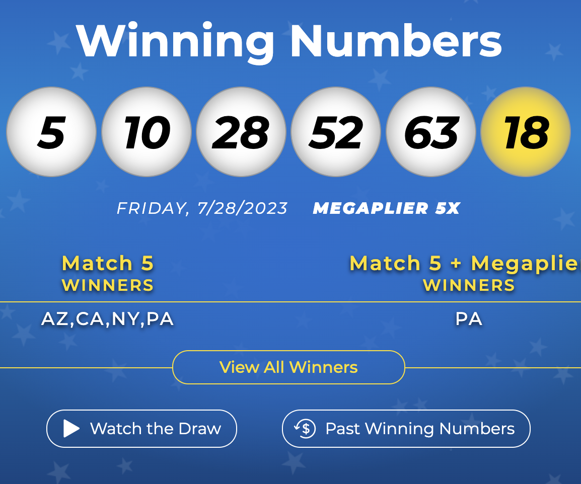 Los números ganadores del viernes 28 de julio fueron 5, 10, 28, 52, 63 y el Mega Ball 18.
