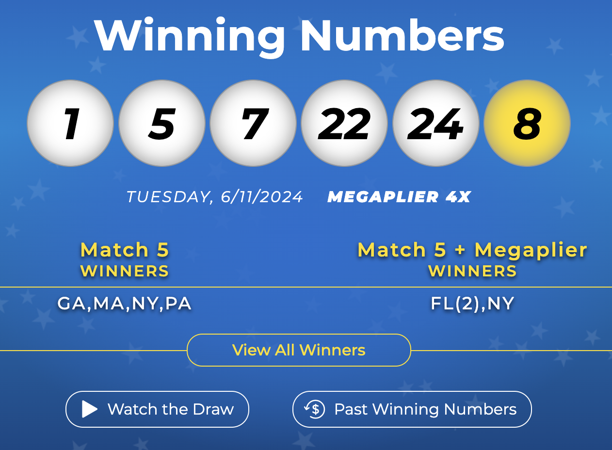 Los números ganadores del martes 11 de junio de 2024 fueron 1,5,7,22,24 y el Mega Ball 8.