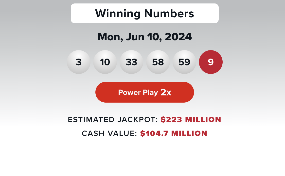 Los números ganadores en el sorteo de Powerball del lunes 10 de junio fueron las bolas blancas 3, 10, 33, 58, 59 y el Powerball 9 rojo. El multiplicador de Power Play® fue 2X.